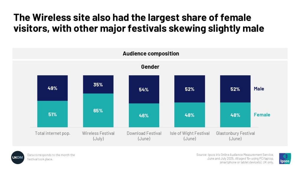 🎧 Wireless Festival tells a different story, with the most distinct audience. Its online visitors average much younger (67% under 35) and have the biggest gender bias, with women making up almost two thirds of visitors.