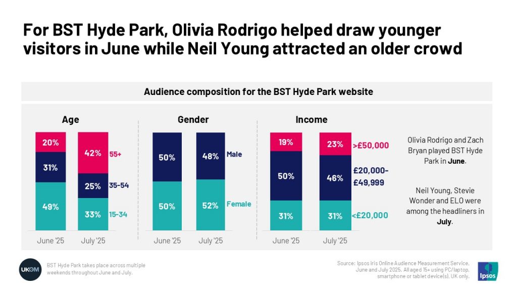 🌳BST Hyde Park runs across June and July – and its audience shifts significantly from one month to the next. In June, Olivia Rodrigo helped attract younger visitors to its site (49% aged 15-34). By July , the likes of Neil Young and Stevie Wonder saw this switch (42% over 55s).